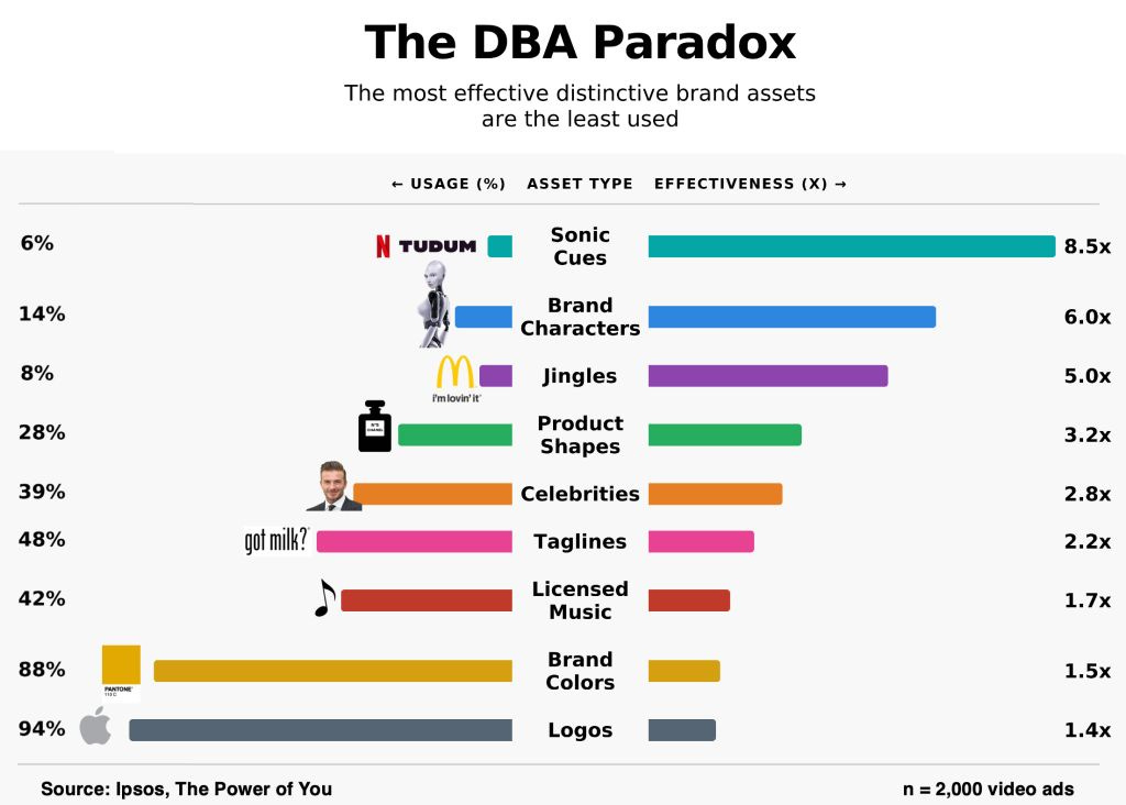 Here’s the paradox most brands miss: The most distinctive assets are the least used. And the least distinctive assets are everywhere.