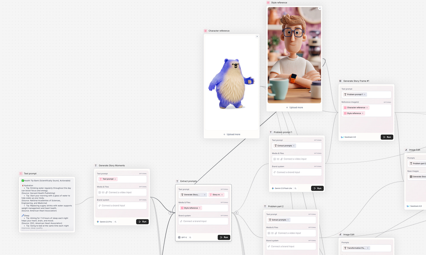 Cost-efficient models: Most of my work happens inside Seedream 4 (image editing) and Seedance Pro (animation). They’re not the newest or flashiest, but they’re super robust and affordable. I still play with new models for fun, but when it’s time to produce, I stick to my mature stack. Find what works for your use-case and build depth.