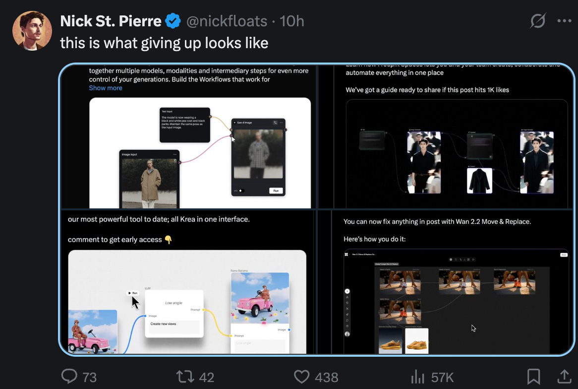 Node-based workflows: Node-based editing is the big leap here. It’s starting to show up everywhere — from Krea to Adobe to Pletor (soon inside Scenario too). It allows you to streamline, visualize, automate big parts of your Gen-AI content generation. Sometimes it’s really hard to see what you are doing if you’re just hitting ‘generate’ every other second, node based changes that.